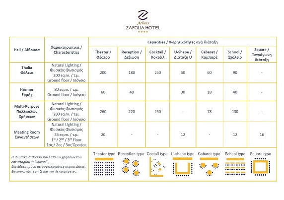 Το εύρος των επαγγελματικών εκδηλώσεων που μπορεί να αναλάβει και να εξυπηρετήσει το Athens Zafolia Hotel περιλαμβάνει,
